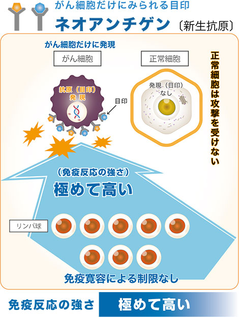この新しいワクチンは、がんのみに発現する新生抗原(ネオアンチゲン)を目印に、リンパ球が攻撃をします。