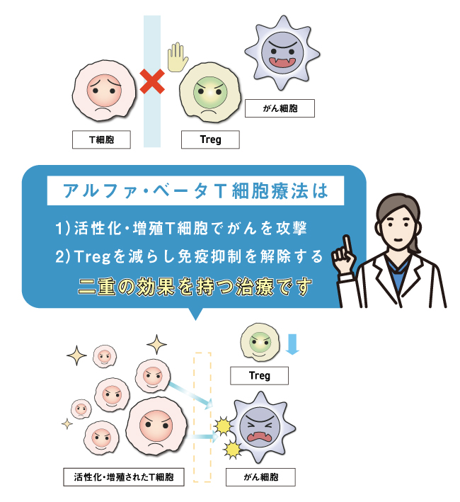 当院で行っているアルファ・ベータT細胞療法は、活性化・増殖させたT細胞でがんを攻撃するとともに、Tregを抑えて免疫抑制を解除する二重効果を持つ治療です。